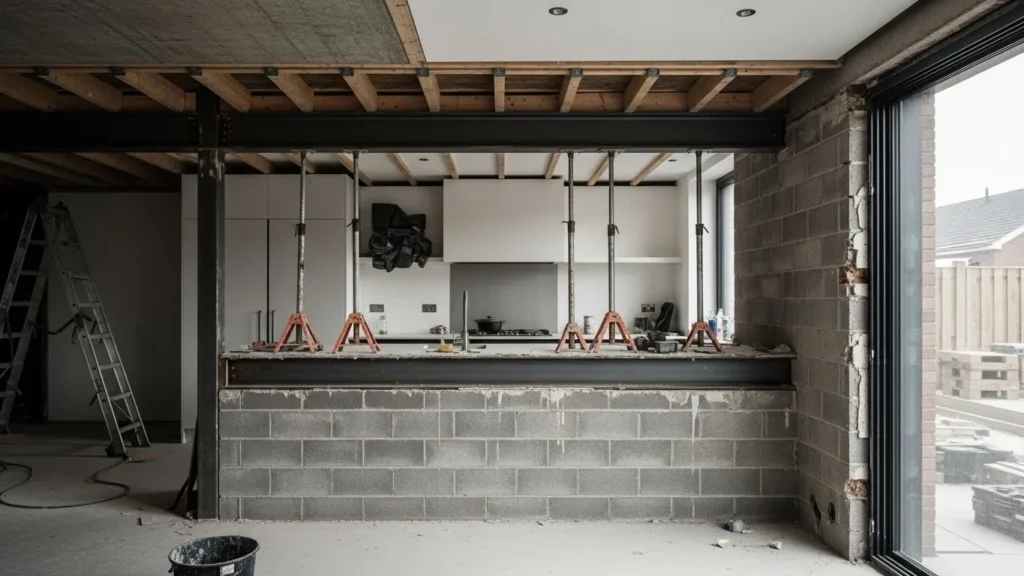 Structural planning and support installation during kitchen wall removal.